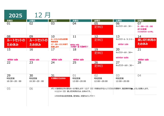 初めての方、初心者の方もランププラスなら安心【12月スケジュール】 12月のスケジュール表ができました。 年内最後のホールド替えを予定しています。 営業時間が変更になっている日がございますので ご来店の前にはご確認をお願いします。 12月もたくさん登りましょう! ご来店をお待ちしています。 2025/11/30掲載 【ホールド替えのご案内】 ホールド替えを行います。 日程は以下の通り↓ 12/7(日)15:00〜外しはじめます 12/8.9 ルートセットのため休み 12/10(水)17:00 NEW SET OPEN 今回は130度の強傾斜は替えません! (まだまだ頑張ってほしい…) 7日のホールド外し作業をお手伝いしてくださる方を 募集しています。お手伝いよろしくお願いします。 2025/11/11掲載 【お知らせ】 11月の予定表ができました。 1日〜9日まではスポルティバシューズ試し履き会開催! 話題のオンドラコンプ、マンダラ、フューチュラ、 スクワマを実際に履いて登れるチャンスです。 是非、お試しください。 営業時間の変更などございます。 ご確認ください。 11月もたくさん登りましょう! 2025/10/27掲載 【お知らせ】 今年もインダスのノスケさんがランプラに 来てくれます!! 日時:10月19日(日)12時〜18時まで シルクスクリーン体験ご希望の方はQRコードから ご予約ください。予約の方優先です。 この機会に、オリジナルカスタムアイテムを ゲットしちゃいましょうー 皆さんのご来店をお待ちしています 2025/09/27掲載 【お知らせ】 連日、厳しい暑さが続いていますね。 熱中症対策をしっかりして、登りましょう! 8月の予定表ができました。 暑さに負けず、登りましょう。 営業時間変更にご注意ください。 8/7(木)18時から営業 8/11,8/13〜8/17 9時〜20時まで 8/31(日)9時〜18時まで 9/1〜9/3まで休業 2025/07/26掲載 |