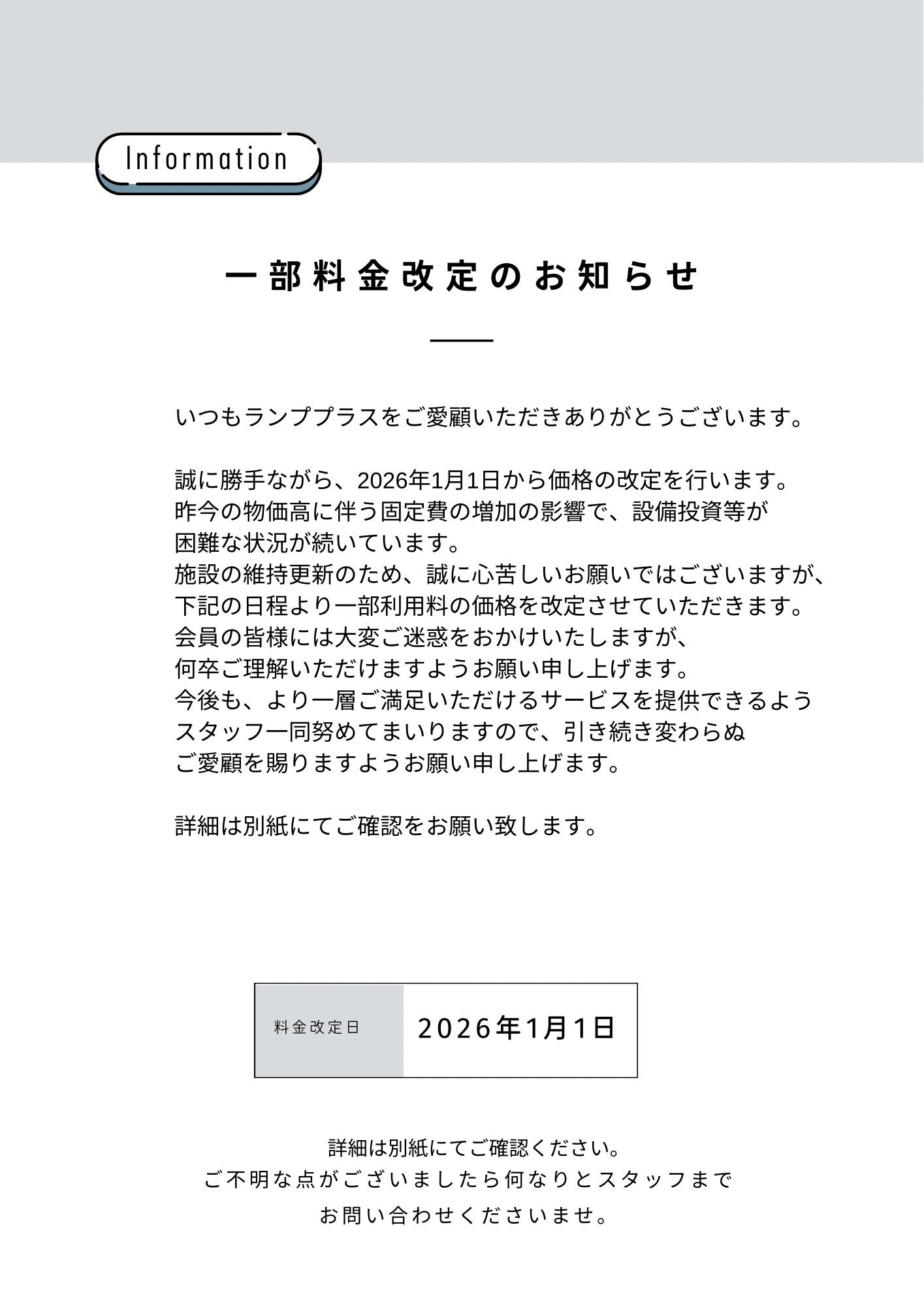 昨今の物価の高騰による固定費増加の影響で、設備投資が困難な状況が続いています。施設維持更新のため、誠に心苦しいお願いですが、価格の改定をさせていただきます。